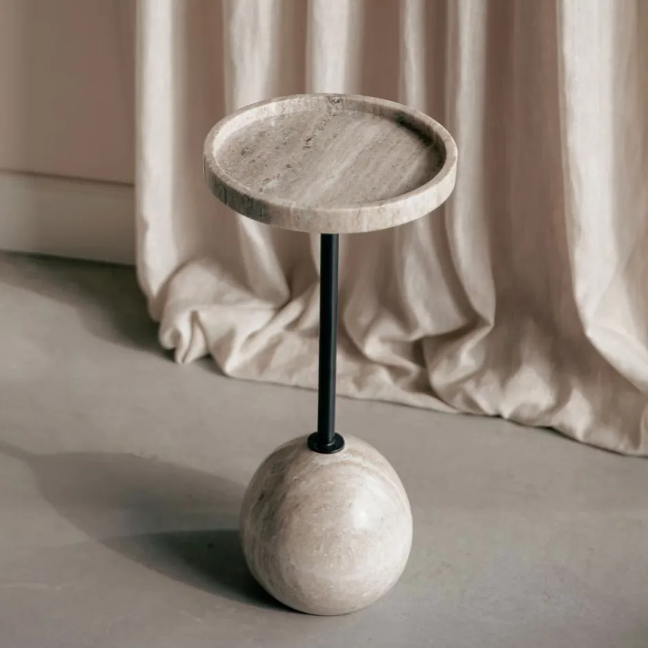Het bruine marmeren blad straalt klasse en luxe uit, terwijl de ronde voet in de vorm van een bal een speels accent toevoegt. De opstaande rand rond het tafelblad zorgt ervoor dat je glazen stevig blijven staan, en de zwarte ijzeren steel in het midden biedt een ondersteuning.