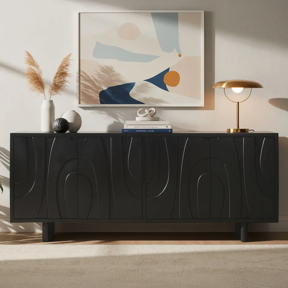 Een dressoir is veel meer dan een functioneel meubelstuk – het is een statement van stijl en kwaliteit. Met zijn tijdloze ontwerp en natuurlijke materialen biedt dit dressoir van massief mangohout een perfecte combinatie van functionaliteit en esthetiek. Het dressoir is 180 cm breed en de royale ruimte maakt het de ideale aanvulling voor de woonkamer, eetkamer of studeerkamer. Het is uitgerust met vier deuren die dankzij hun eenvoudige elegantie harmonieus in het geheel passen. Het diepe zwart van het mangohout geeft de ruimte een elegante uitstraling en creëert een stijlvolle sfeer. Achter de deuren bevinden zich vier ruime vakken die veel opbergruimte bieden voor servies, boeken, decoraties of andere alledaagse voorwerpen. De duidelijke indeling zorgt ervoor dat alles zijn plek vindt en makkelijk toegankelijk is. Een ander hoogtepunt zijn de stevige houten zijkanten, die het dressoir een krachtige en tegelijkertijd harmonieuze uitstraling geven. Dit dressoir van massief mangohout combineert hoogwaardige materialen, praktische functionaliteit en tijdloos design. Met zijn royale afmetingen, slimme opbergoplossingen en warme uitstraling is het de perfecte keuze voor iedereen die waarde hecht aan stijl en kwaliteit. Als blikvanger in de woonkamer of als praktisch meubel in de eethoek – dit dressoir is een echte allrounder.