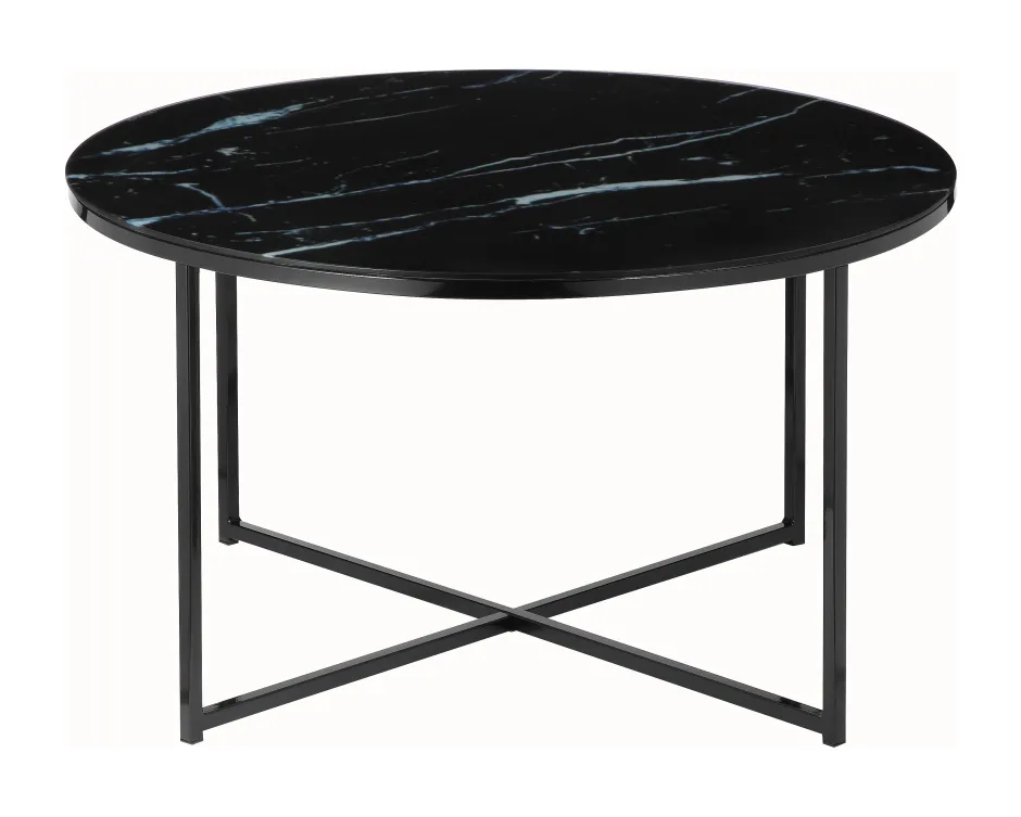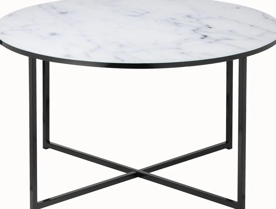 De ronde salontafel combineert modern design met een dosis extravagantie. Het glazen blad met onderliggende marmerlook folie past perfect bij het zwart metalen frame. De banktafel biedt voldoende opbergruimte voor bijvoorbeeld tijdschriften, fruit, knabbels of een bloemenvaas. Dankzij het aantrekkelijke ontwerp en de ronde vorm is deze salontafel met veel meubels te combineren en zal hij ook in jouw huis een passende plaats vinden.