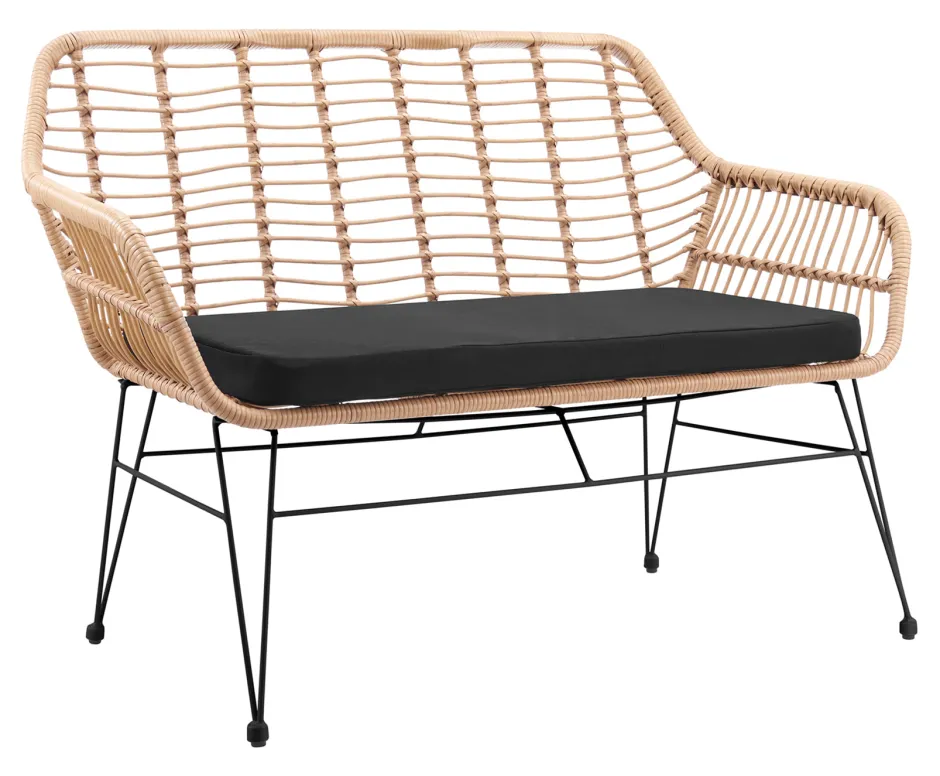 De trendy bank maakt indruk met zijn zitting en rugleuning in natuurlijke rotanlook en een stevig metalen frame in zwart. Dit bankje is weerbestendig en daardoor geschikt voor binnen en buiten. Het stevige metalen frame zorgt niet alleen voor een stabiele stand, maar biedt ook een mooi contrast met de rotan-look. De comfortabele zitschaal, die gemaakt is van 100% polypropyleen, biedt je een aangenaam zitcomfort. Een extra zitkussen in de kleur zwart maakt de look compleet. Een vleugje vakantiegevoel voor je woon- of tuinruimte!