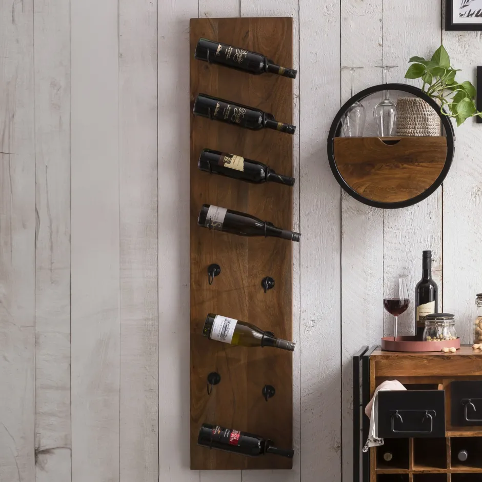 Met dit praktische wijnrek kun je 4 wijnflessen tegelijk ruimtebesparend en decoratief aan de muur opbergen. De combinatie van meerdere wandplanken vergroot de capaciteit en stelt geen grenzen aan de creatieve en individuele opstelling. Het warme acaciahout en de antiek zwarte metalen haken in combinatie met de edele wijnflessen roepen een stijlvolle en gezellige flair op.