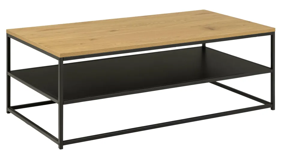 Een moderne, chique en praktische salontafel? Je hebt het. Door het melamine tafelblad is de tafel gemakkelijk schoon te vegen. De combinatie van wild eiken melamine en zwart metalen onderstel geeft de tafel een krachtige uitstraling. Het vierkante metalen onderstel zorgt ook voor stevigheid. Gebruik de plank als een plek voor kleine opslag, zoals tijdschriften, een afstandsbediening voor de tv, maar ook bits en bobs.