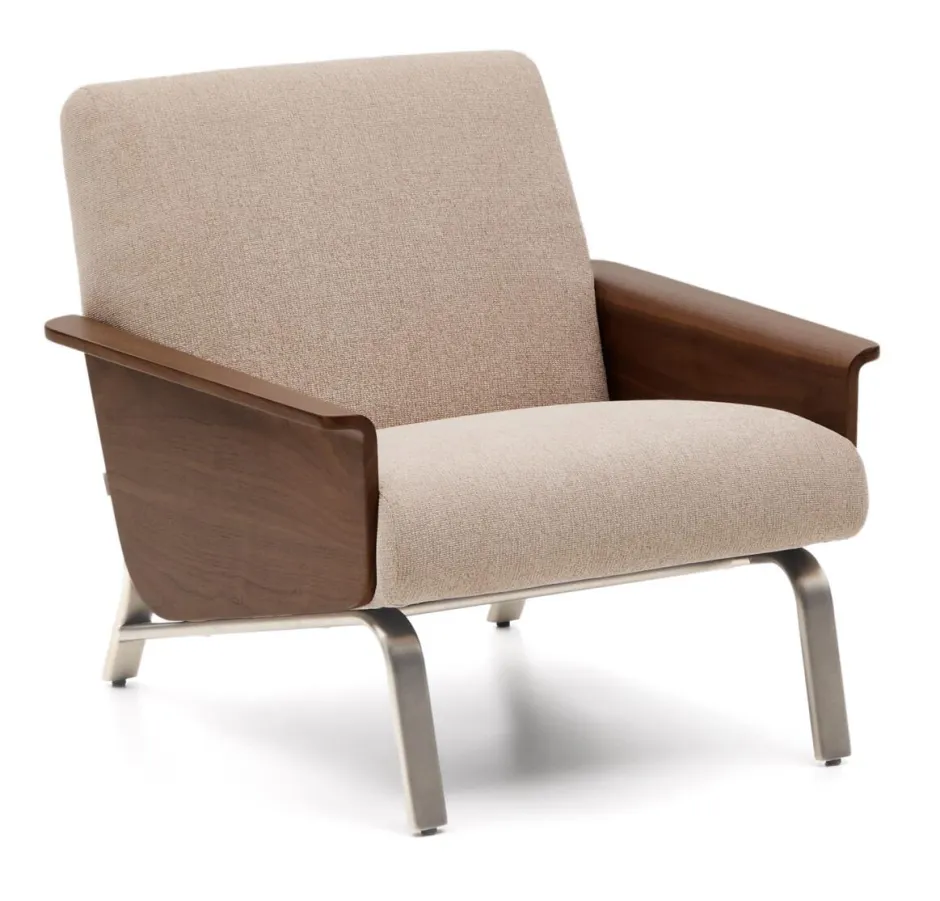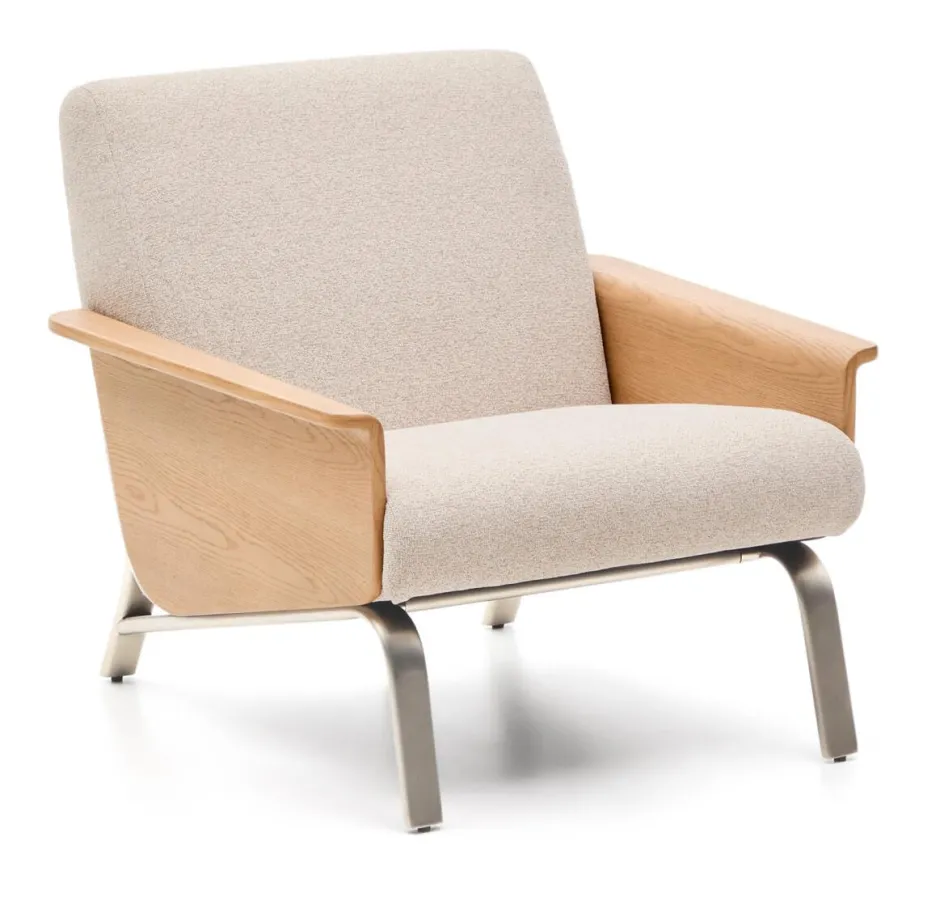 Deze collectie met een elegant en tijdloos ontwerp speelt de hoofdrol in elke ruimte. De chenille bekleding met fijne structuur zorgt niet alleen voor een warme en elegante textuur, maar is ook gemaakt van 100% gerecycled polyester met een waterafstotende behandeling. Dit materiaal is afkomstig van een Global Recycled Standard-gecertificeerde leverancier, wat minder gebruik van grondstoffen en nieuw materiaal garandeert. Bovendien is de stof OEKO-TEX® STANDARD 100-gecertificeerd wat een ecologisch veilige en milieuverantwoorde productie garandeert. De structuur van deze fauteuil combineert de weerstand van multiplex van 18 mm dik, bedekt met eikenfineer, met de visuele aantrekkingskracht van de strak gelijnde armleuningen. De poten zijn gemaakt geborsteld roestvrij stalen buizen met een diameter van 1,8 mm en geven het ontwerp een eigentijds en stabiel uiterlijk. De gemiddelde hardheid van de zitting is ideaal voor dagelijks gebruik, dankzij een zorgvuldige combinatie van banden, veren en schuimlagen met hoge dichtheid (35 kg/m³ en 40 kg/m³), die stevigheid, duurzaamheid en uitstekend comfort bieden.