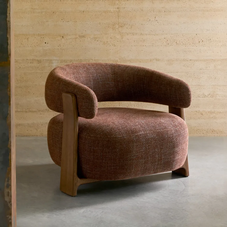- Fauteuil bekleed met chenille met gerecycled polyester met een grove structuur in tweekleurig beige en poten van massief essenhout met noten afwerking.