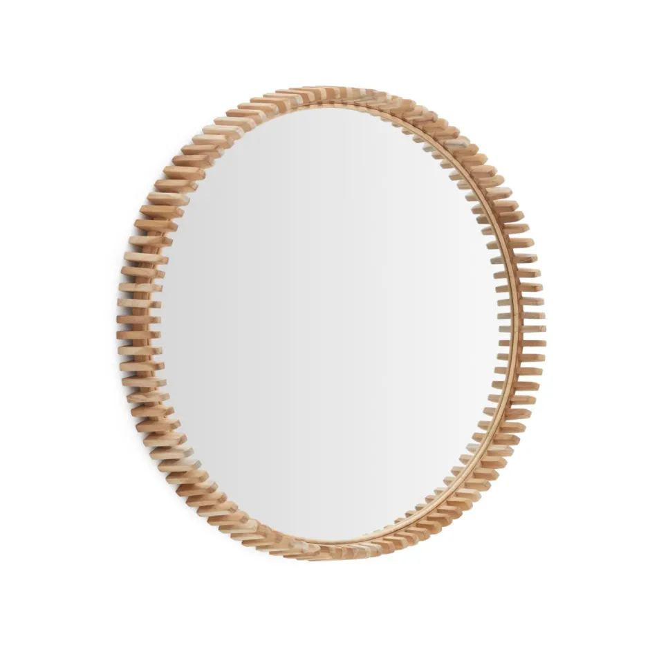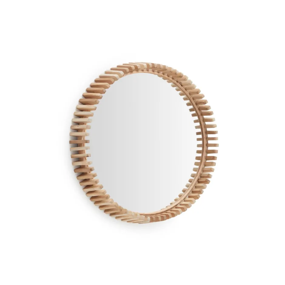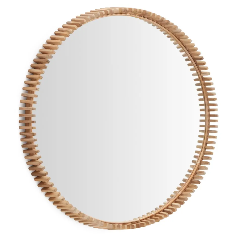 De Polke spiegel heeft een frame van uitgesneden stukken, stuk voor stuk geplaatst, van massief natuurlijk teakhout. Het is een stuk met een aanpasbare diameter voor elke ruimte en een ontwerp dat past bij elke trendsettende stijl.