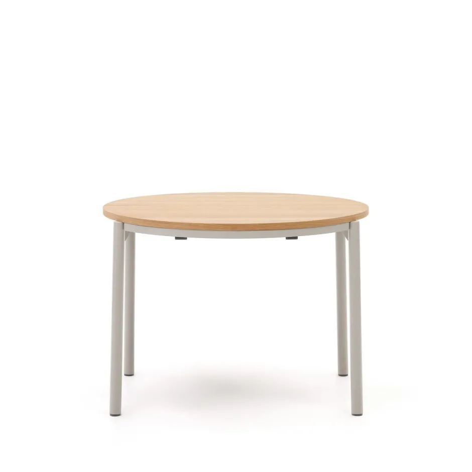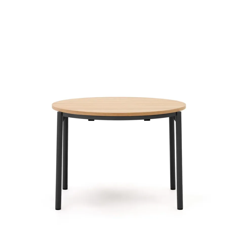 - Uitschuifbare ronde tafel van eikenfineer met grijs afgewerkte stalen poten.