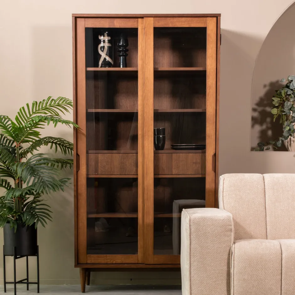 Vitrinekast Jule van LABEL51 is een trendy meubel uitgevoerd in eikenfineer. Een strak vormgegeven meubel waar al jouw spullen in opgeborgen kunnen worden.
