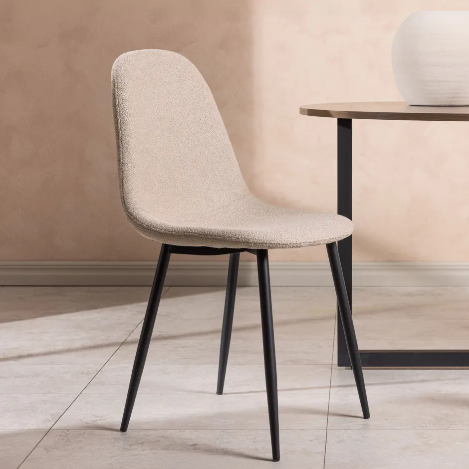 Stijlvolle eetkamerstoel in moderne kleuren met modern Scandinavisch design – wat wil je nog meer? Austina heeft een volledig aangekleed ontwerp, poten van zwart gepoedercoat metaal en een afgeronde rugleuning en zitting van beige boulene stof met zachte vulling. Je hoeft geen compromis te sluiten tussen comfort en design, hier zit je lekker lang en krijg je een mooie blikvanger bij de aankoop!