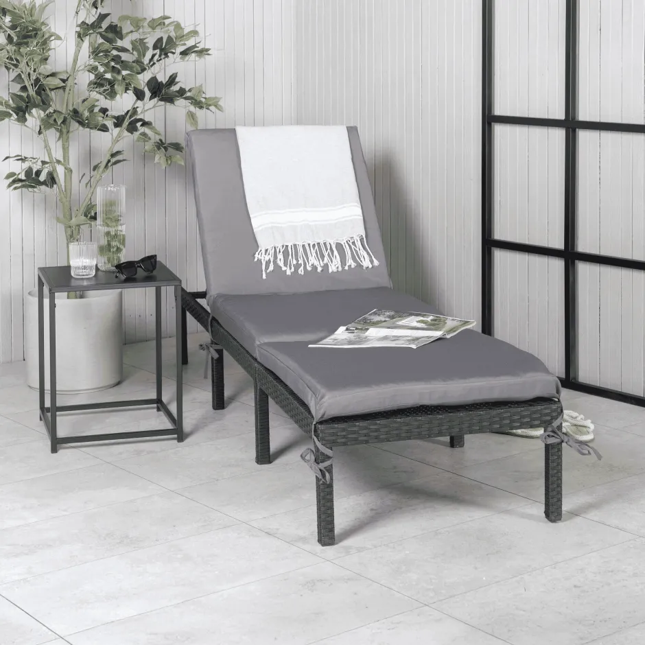Stijlvol en comfortabel ligbed van grijs kunstrotan. De rugleuning van de stoel is verstelbaar, grijs ligbedkussen is inbegrepen. Geniet van alle zomerse momenten – netjes en comfortabel!
