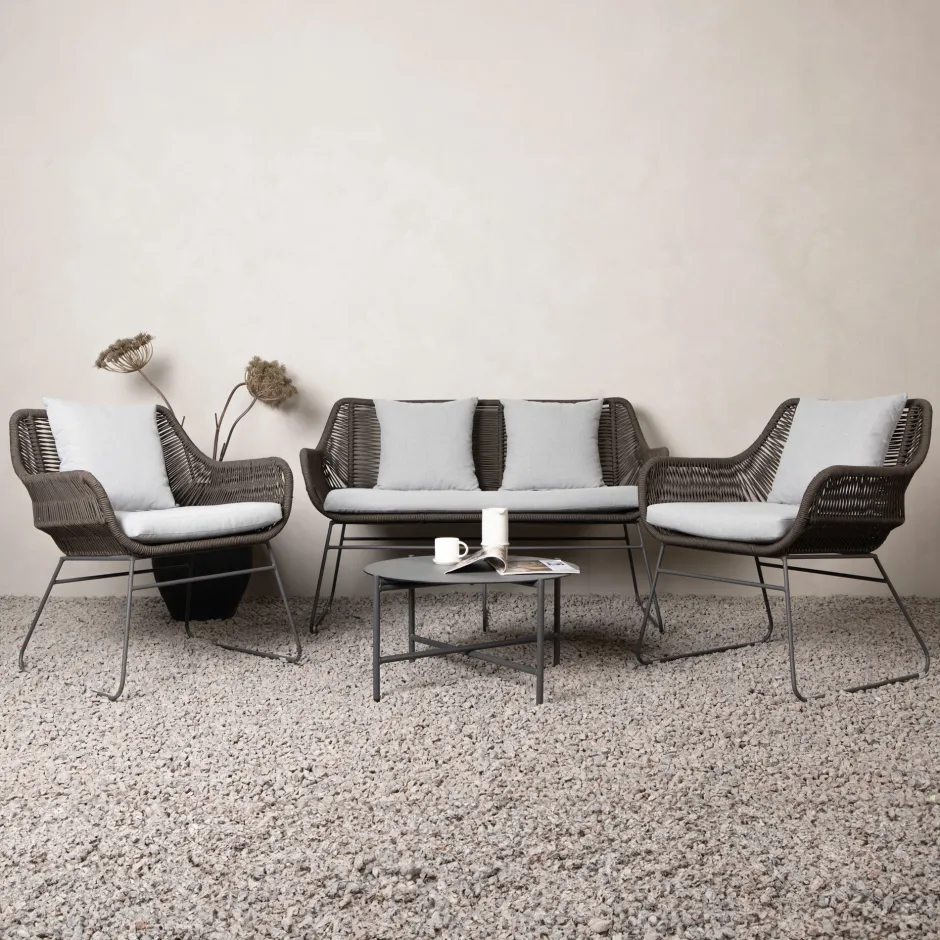 De Missie bankgroep heeft een tijdloos kleurenschema met een bruin frame en grijze kussens, waardoor het een veelzijdige en smaakvolle toevoeging is aan je buiteninrichting. Het product is ontworpen met flexibiliteit en eenvoudige draagbaarheid in gedachten. Of je nu je buiteninrichting wilt veranderen of de meubels wilt verplaatsen, Missie is handig en praktisch.