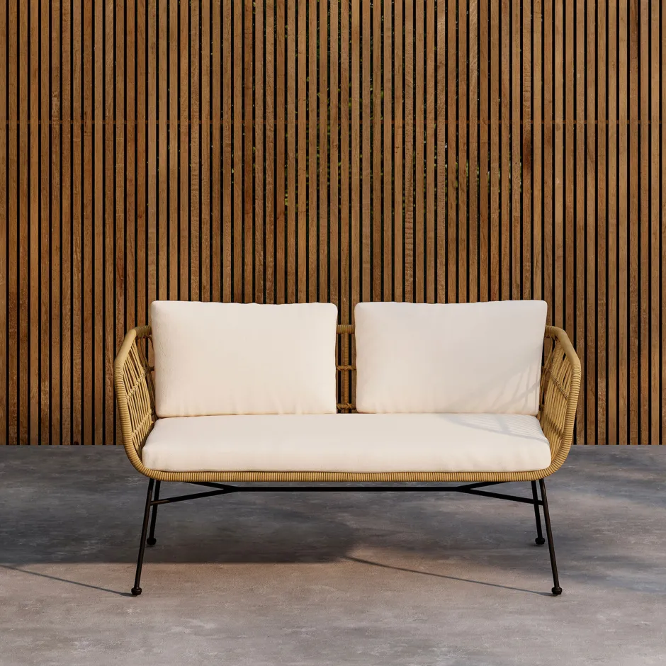 Marison is een stijlvolle tweezitsbank die elke buitenruimte opfleurt met zijn moderne design en comfort. De bank heeft een stevig stalen frame, wat zorgt voor stabiliteit en een lange levensduur. De zitting is bekleed met mooi rotan, wat een natuurlijke en uitnodigende sfeer geeft.