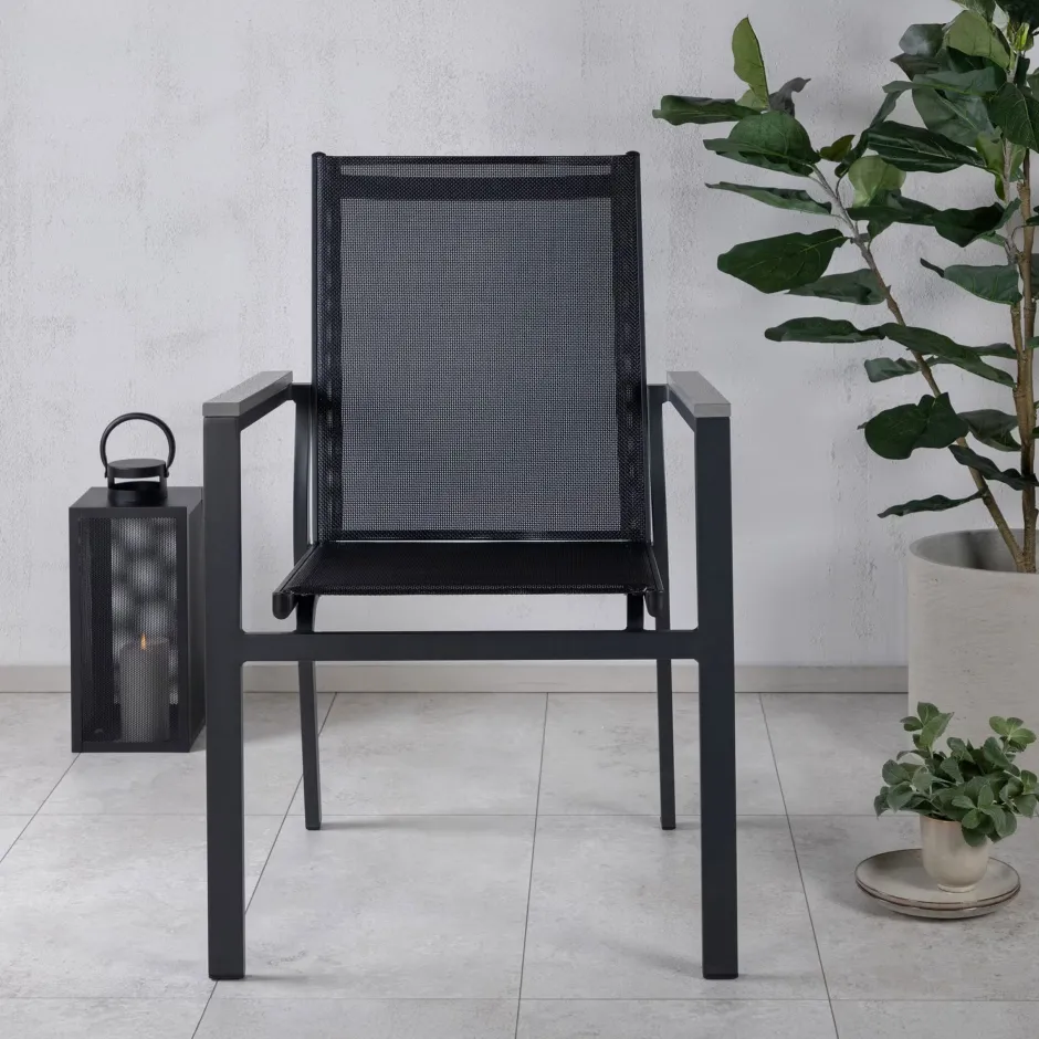 Marnell is onze populaire fauteuil in klassiek, industrieel ontwerp en rechte Scandinavische vormen. De consequent zwarte kleur zorgt voor een luxueus gevoel en het duurzame materiaal aluminium en textiel geven je een stoel die lang meegaat. De stoel heeft armleuningen in grijs Aintwood wat een smaakvol detail wordt. Marnell is ook stapelbaar waardoor je hem gemakkelijk kunt opbergen.