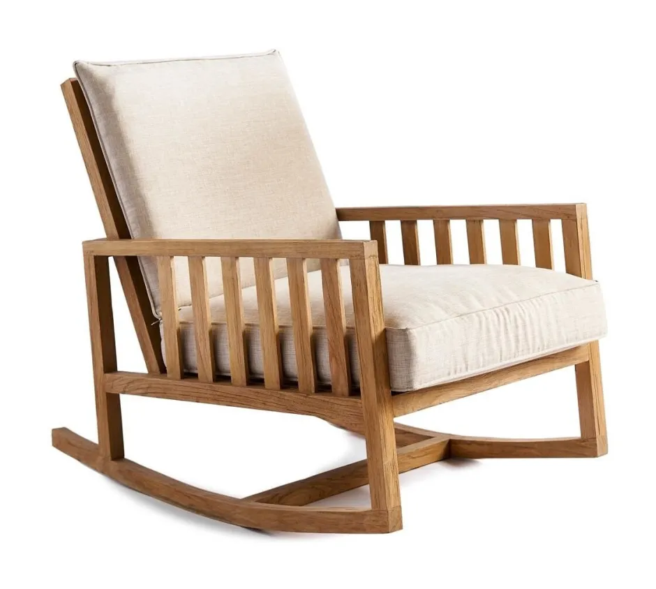 Lekker licht schommelend de zomeravond langs laten glijden. Haal er in gedachten de mondharmonica bij en een fles van het een of ander uit de ruige tijd van de Verenigde Staten, en de sfeer is compleet. Dankzij dit uniek gemaakte meubelstuk, waar zoveel vakmanschap en liefde in zit, dat een mens zich er wel goed in moet voelen. Het hout is teak, en de zitting en rug zijn van katoen.