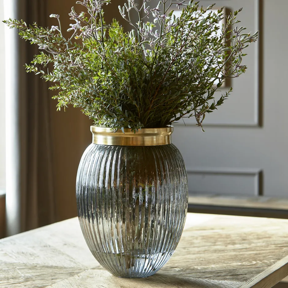Haal allure in huis met RM Chatel vaas. Het glanzende ribbel glas met luster-effect en gouden rand maken het een echt statement piece. Door de rustige grijs-blauwe tint combineer je deze vaas moeiteloos met je andere accessoires in huis. Een perfecte plek voor een groot boeket bloemen en een onmisbare toevoeging aan elk modern interieur!