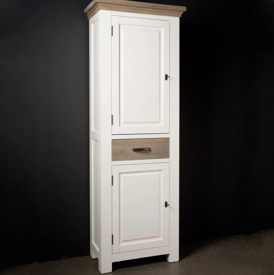 De kast is gemaakt van rustiek eiken en grenen. De eiken delen worden licht geborsteld en afgewerkt met een olie. Het witte grenen frame van de meubelen wordt op enkele plaatsen lichtelijk opgeschuurd.