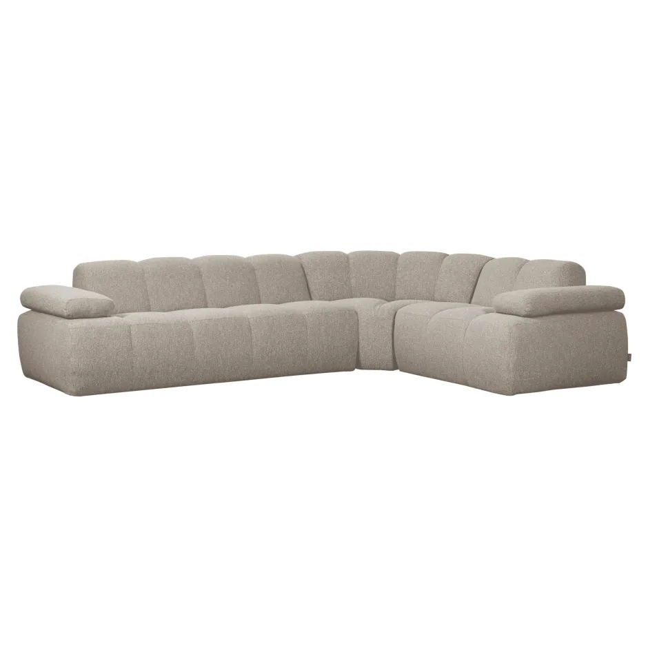 De Mojo hoekbank van WOOOD combineert comfort met een speelse uitstraling. De bank is bekleed met geweven Remy ribstof in een beige kleur, wat zorgt voor een zachte, uitnodigende sfeer in de woonkamer. De verticale stiksels geven de bank extra karakter en structuur.