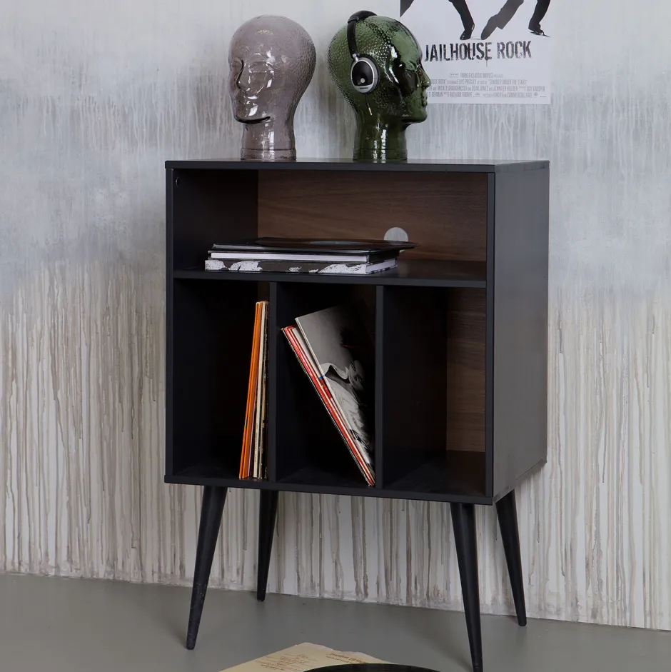 Het kastje is speciaal ontwikkeld om in de 3 vakken aan de onderzijde LP’s te plaatsen ( H 35 x B 18 cm). Het brede vak bovenin is ontworpen om de versterker in te plaatsen, daar is namelijk een gat in de achterzijde van het kastje gemaakt om je snoeren doorheen te halen. Je kunt het kastje natuurlijk ook gebruiken voor andere functies!