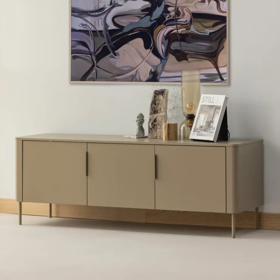Strak en modern, dat zijn de eigenschappen van het Gunnar tv-meubel, afkomstig van het Nederlandse interieurmerk WOOOD. Berg je accessoires veilig op achter een van de vier deurtjes en geniet van een avondje tv-kijken op de bank. Extra leuk: je kiest zelf of je het meubel ophangt of neerzet. Dit royale tv-meubel heeft een matte mudkleurige afwerking en is een stijlvolle toevoeging aan jouw interieur!