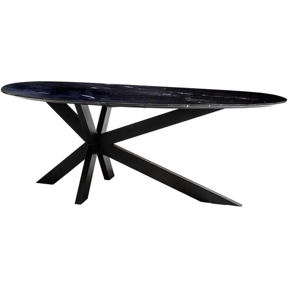 Het ijzeren onderstel heeft een moderne kruispoot, die niet alleen zorgt voor een stevige basis, maar ook een stijlvolle uitstraling toevoegt. De ‘Trocadero’ eettafel combineert tijdloze schoonheid met modern design en past perfect in een hotel chic interieur.
