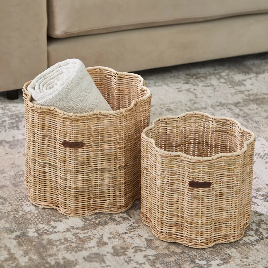Voeg een speelse en elegante touch toe aan je interieur met deze set van Rustic Rattan manden in een vorm van een bloem. De grotere mand is perfect voor het opbergen van plaids, kussens of andere grotere items, terwijl de kleinere mand ideaal is voor tijdschriften, accessoires of een klein plantje. Beide manden hebben een charmant, natuurlijk rattan ontwerp dat zorgt voor een gezellige en rustieke sfeer. Deze set is zowel functioneel als decoratief, en zorgt ervoor dat je opbergruimte er altijd stijlvol uitziet. De manden zijn ook los verkrijgbaar.