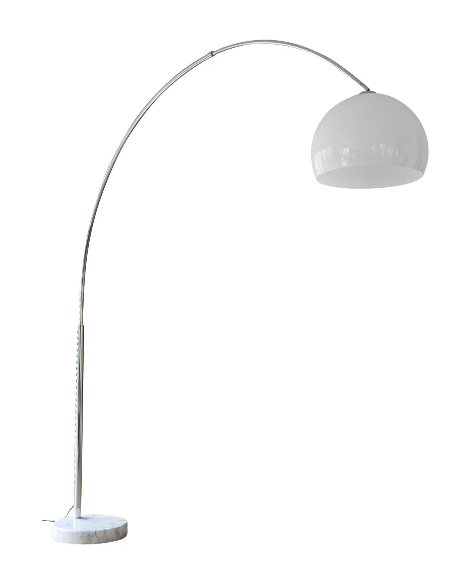 De XXL booglamp staat voor verfijnd lounge design in de stijl van de jaren 60 en 70. De in hoogte verstelbare lampenkap van wit kunststof heeft een diameter van 40 cm. Terwijl het frame van metaal is, is de zware en tegelijk mooie voet van marmer. Dit ziet er niet alleen extravagant uit, maar biedt de vloerlamp ook een enorme stabiliteit. De lamp wordt handig in- of uitgeschakeld via een voetschakelaar. De in hoogte verstelbare booglamp bereikt een maximale hoogte van 250 cm en kan dankzij de gebogen vorm in elke lees- of tv-hoek worden geïntegreerd. Het aangenaam warme licht en de meegeleverde dimschakelaar zorgen voor een gezellige sfeer in elke kamer.