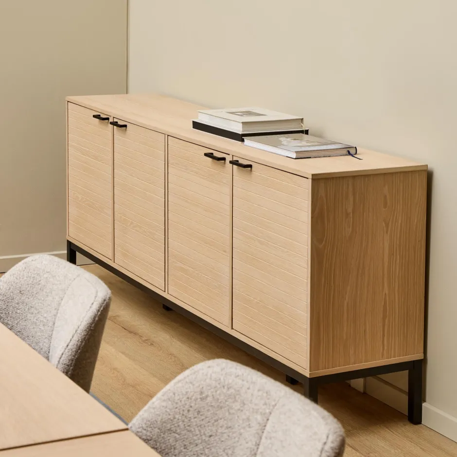 Dit opvallende dressoir zorgt voor een verfrissende energie in het interieur. Door zijn contrasterende uiterlijk, verkregen door het mengen van wit gepigmenteerd geolied eikenfineer en zwart gelakt eiken, versterkt het dressoir de dynamiek in de kamer. Het is ontworpen met 4 verstelbare planken die verborgen zitten achter 4 deuren die versierd zijn met decoratieve lamellen.