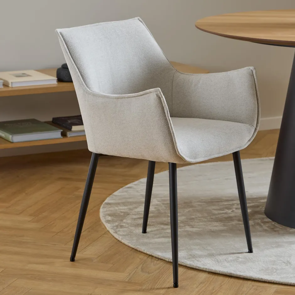 Als je deze eetkamerstoel in een paar woorden zou moeten beschrijven, zou dat waarschijnlijk eenvoudig maar toch extra zijn. Gekleed voor grote en kleine gelegenheden, zijn de kenmerkende eigenschappen van deze stoel onder andere de puntige uiteinden, het toegankelijke karakter, de gestructureerde beige bekleding en het elegante Franse stiksel. Zo’n stoel past in allerlei interieurs.