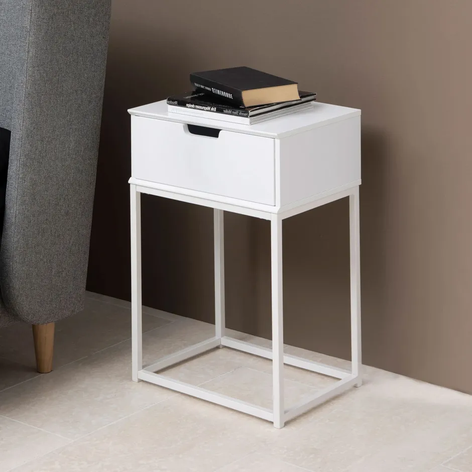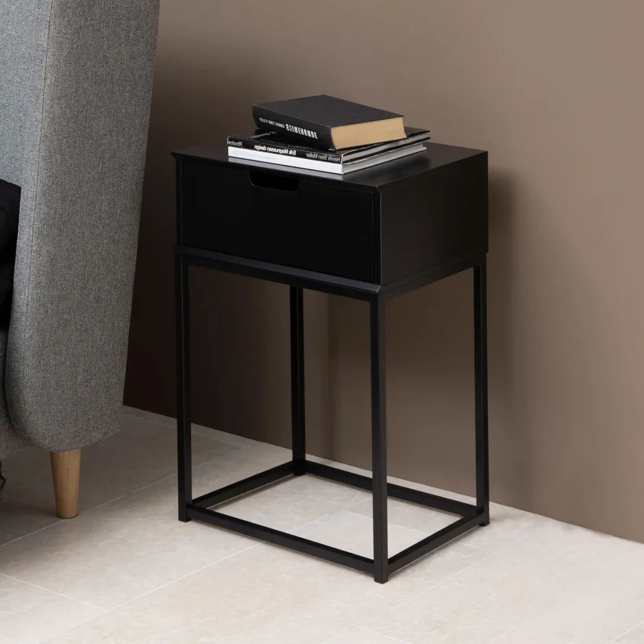 Verfraai je slaapkamer met dit elegante nachtkastje. De houten lade biedt praktische opbergruimte zodat je je benodigdheden bij het bed kunt bewaren. Het zwart gelakte blad past perfect bij het gepoedercoate metalen onderstel. Let op het geïntegreerde handvat voor een elegant detail.