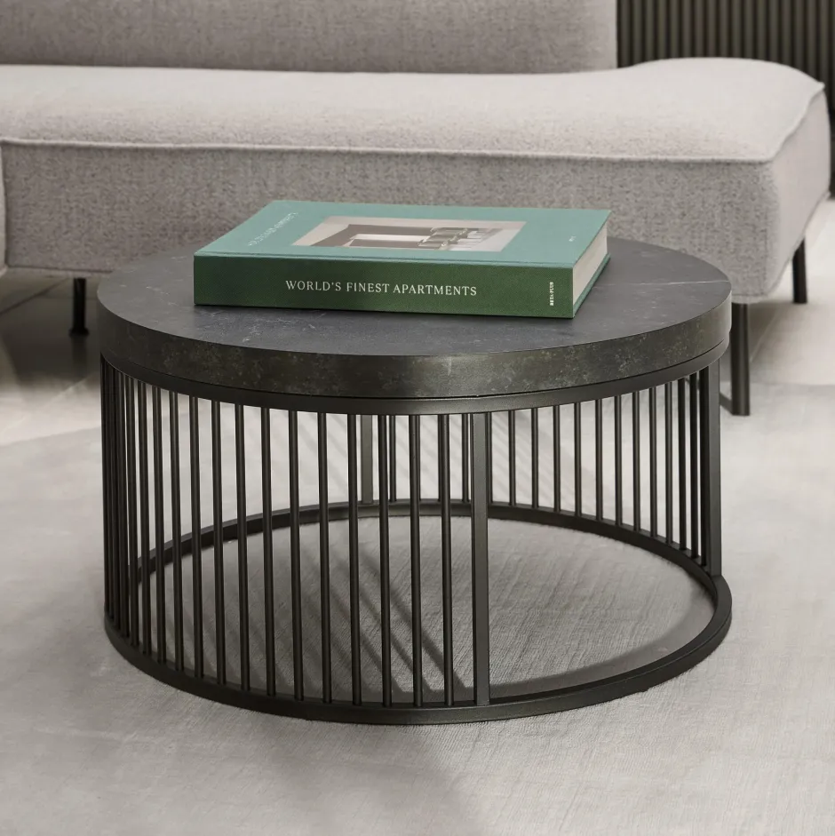 Deze ronde salontafel prikkelt het zicht met opvallende elementen die hem zijn kenmerkende uiterlijk geven. Het gewaagde ronde blad, versierd met een zwarte marmeren look, is gevat in een zwart stalen frame met verticale draden. De combinatie creëert een flatteus contrast tussen de twee elementen. Zo’n ontwerp maakt een blijvende indruk in elke woonruimte.