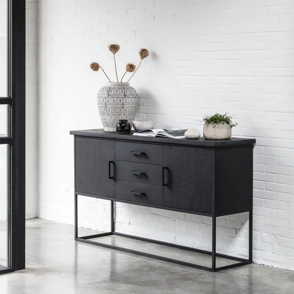 Dressoir Beam is een meubel uit de collectie van DTP Home Timeless Black. Het meubel is gemaakt van gerecycled teakhout en voorzien van een zwarte beits met een transparante lak. De afmeting van het dressoir is 90x158x43 cm en bestaat uit 2 deuren en 3 lades.