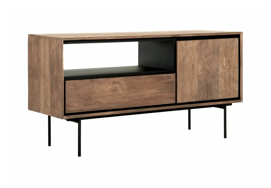 TV-meubel Metropole is gemaakt van gerecycled teakhout en heeft ronde, metalen pootjes. De Metropole collectie kenmerkt zich door het verjongen van de randen van kastdeurtjes en tafelbladen. TV meubel small heeft 1 deurtje, 1 lade en 1 open vak. De afmetingen van het TV meubel zijn 60x115x40 cm en van het open vak 16×66 cm.