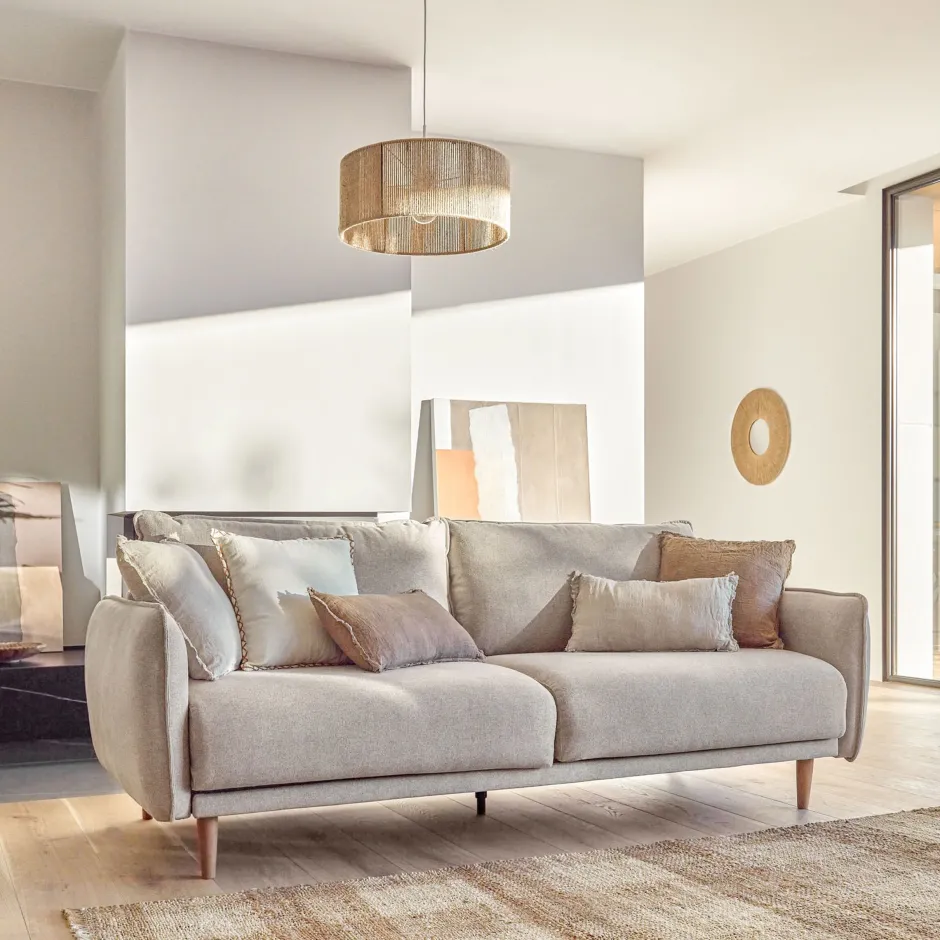 Kave Home ontwerpt een bank die aan alles denkt. Stijlvol, gezellig dankzij de chenillebekleding en duurzaam dankzij de gerecyclede PET-bekleding, E0-structuur en lokale productie.