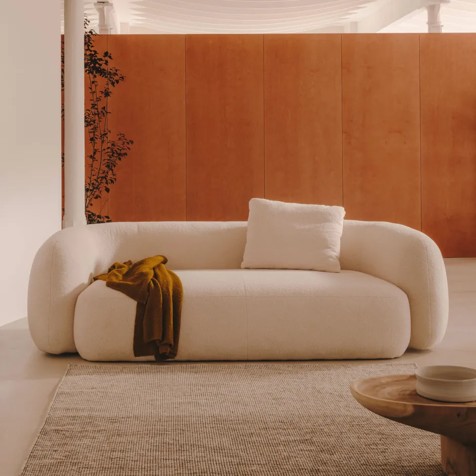 Martina is geïnspireerd door de trend van organische vormen en kronkelende lijnen en een strak geometrisch ontwerp met gebogen en afgeronde volumes, waardoor het superieur comfort en elegantie uitstraalt. De Martina 3-zitsbank valt op door zijn warme en zacht aanvoelende bekleding met bouclé-effect, gemaakt van 100% gerecycled polyester. Elke meter bekleding bevat minstens 32 gerecyclede flessen van 500 ml. Bovendien is de stof zeer slijtvast, wat zorgt voor een onberispelijk uiterlijk en een lange levensduur, ideaal voor dagelijks gebruik. De gemiddeld harde zitting bestaat uit een combinatie van banden en gemiddeld hard schuim met een dichtheid van 30 kg/m3 en is ontworpen voor een lange levensduur. De rugleuning bevat schuim van 20 kg/m3 voor een comfortabele en omhullende ondersteuning. Voor een nog persoonlijkere en comfortabelere ervaring raden we aan de rugleuning te combineren met kussens, die apart verkrijgbaar zijn. De leverancier van de stof is Global Recycled Standard-gecertificeerd, wat minder gebruik van grondstoffen en nieuw materiaal garandeert, en het OEKO-TEX® STANDARD 100-certificaat staat voor ecologisch veilige en milieuverantwoorde productie. De structuur combineert stevigheid en betrouwbaarheid dankzij het FSC Mix Credit-gecertificeerd hout, gemaakt van een mix van materialen uit FSC-gecertificeerde bossen en FSC-gecontroleerd hout. De lokale productie in Europa zorgt ervoor dat er minder CO2 wordt uitgestoten en het milieu minder wordt belast.