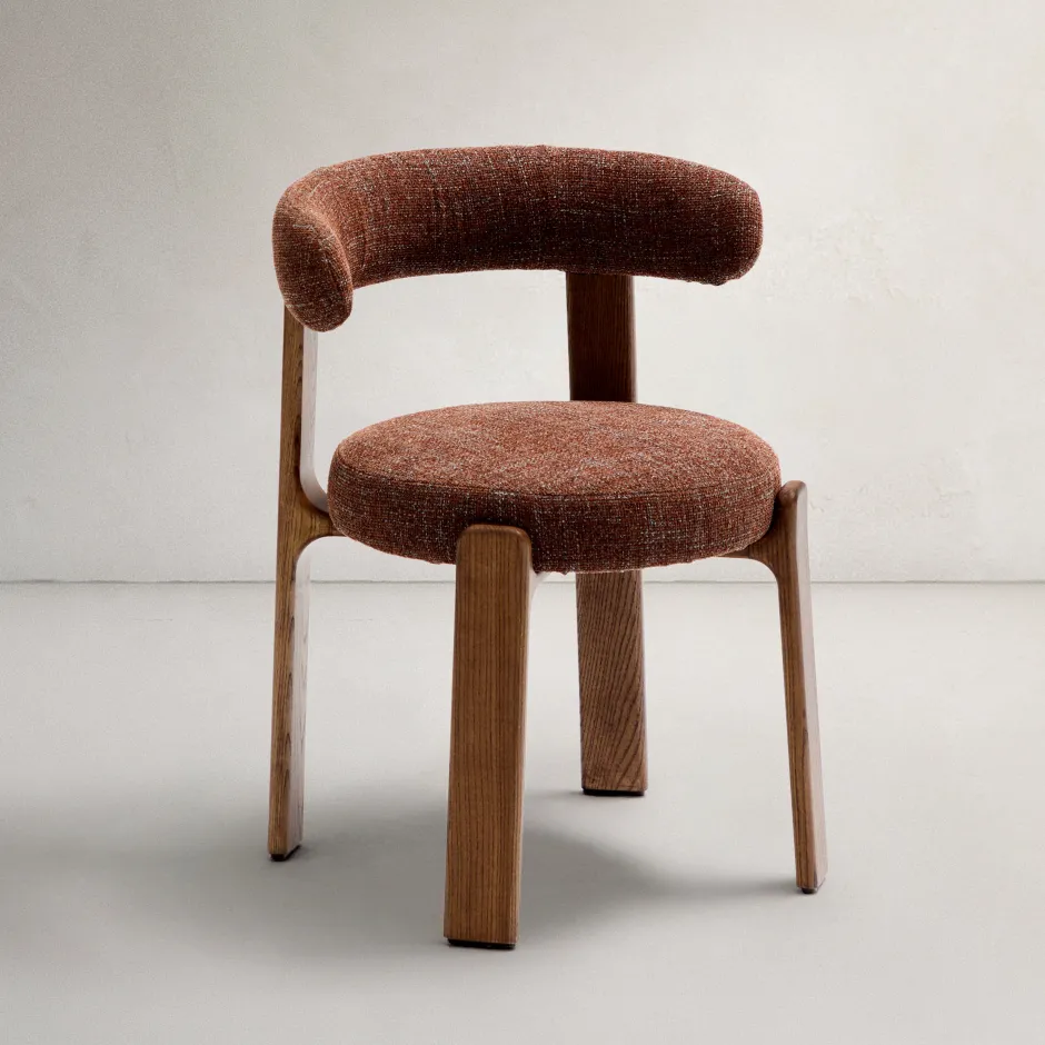 - Stoel bekleed in chenille met gerecycled polyester met een grove structuur in tweekleurig beige.