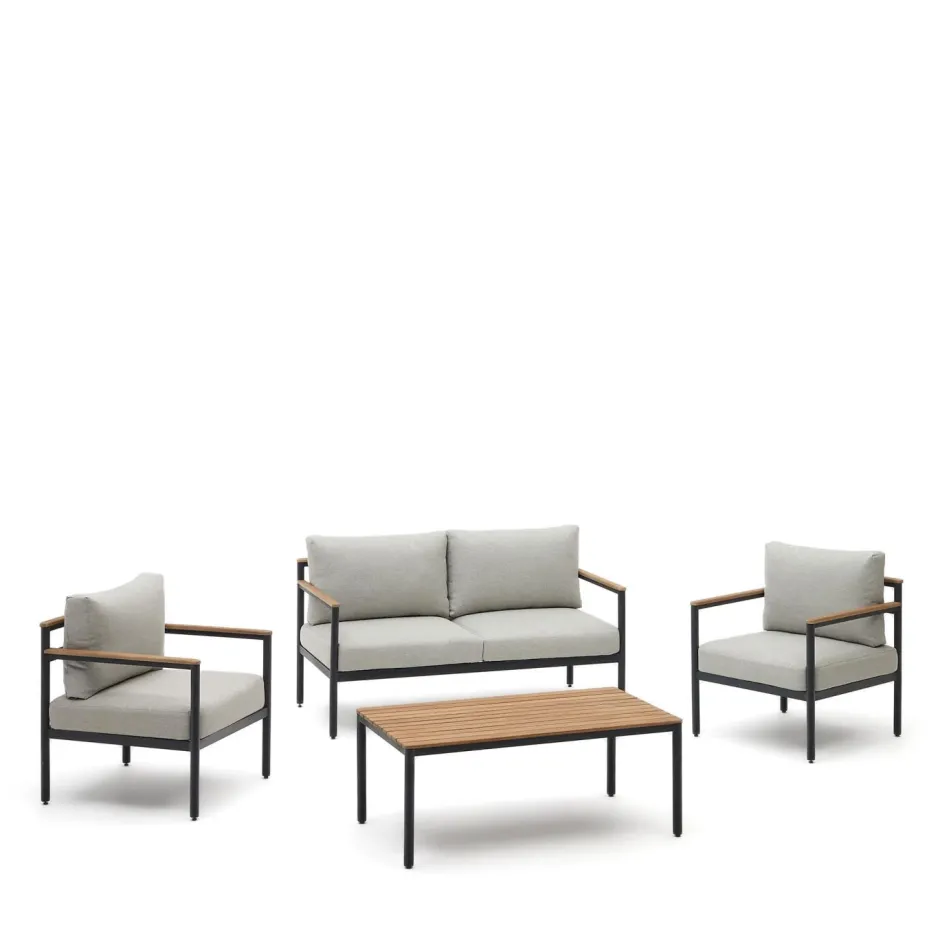 Heb je een kleine buitenruimte? We hebben de perfecte set. Aiguafreda omvat de 2-zitsbank, 2 fauteuils en de salontafel, om op een praktische manier en met maximaal comfort van uw avonden te genieten.