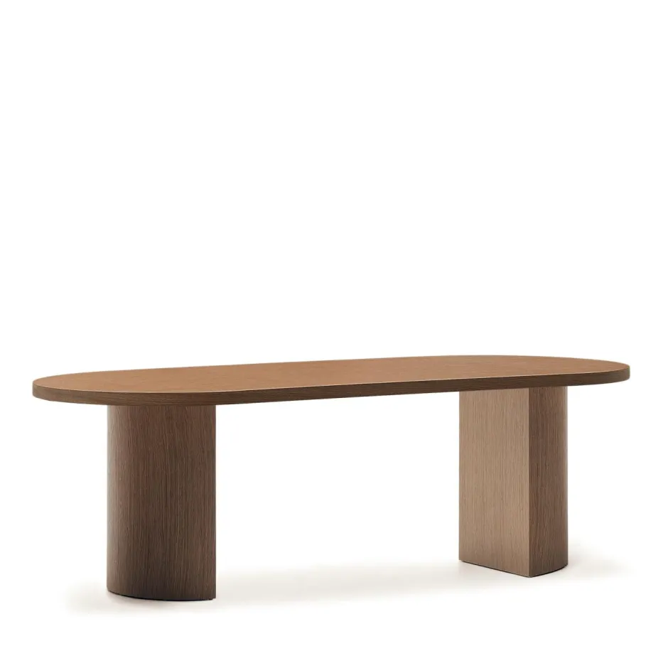 - Eettafel van walnootfineer met een donkere afwerking.