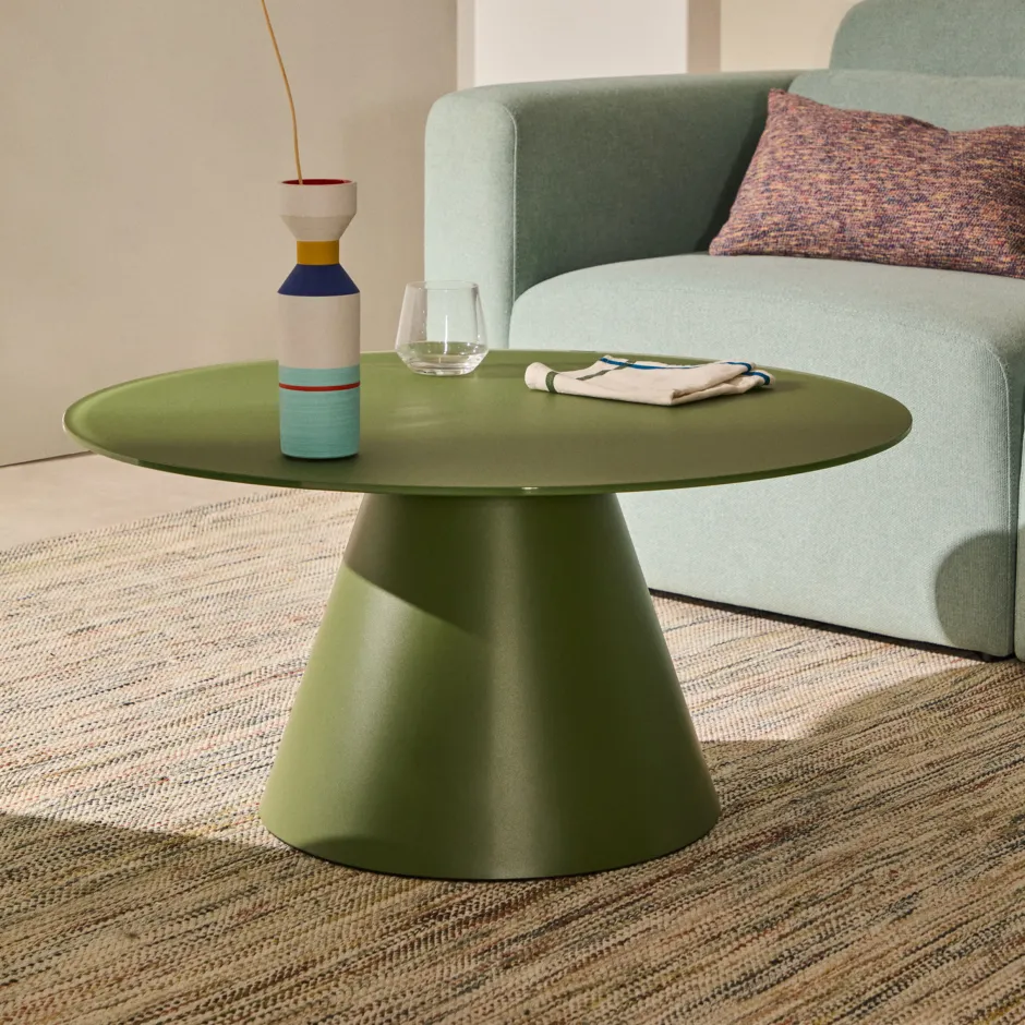 De Wilshire tafel heeft een in massa geverfd blad van gehard glas, waarbij de kleur tijdens de productie direct in het g…