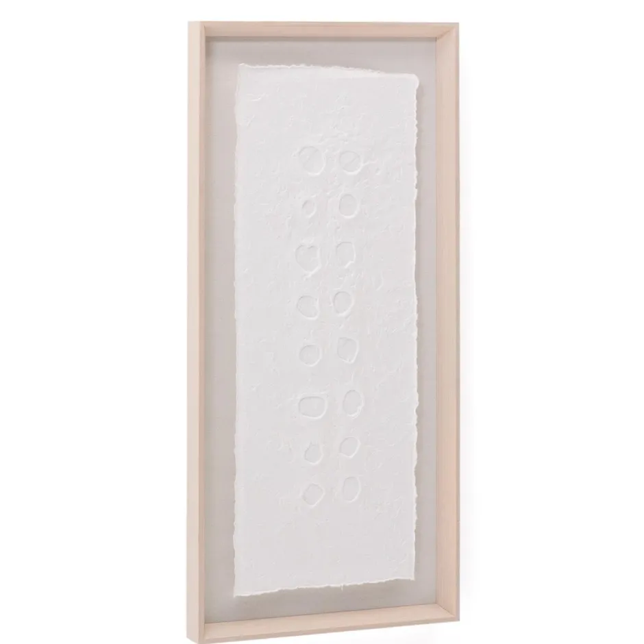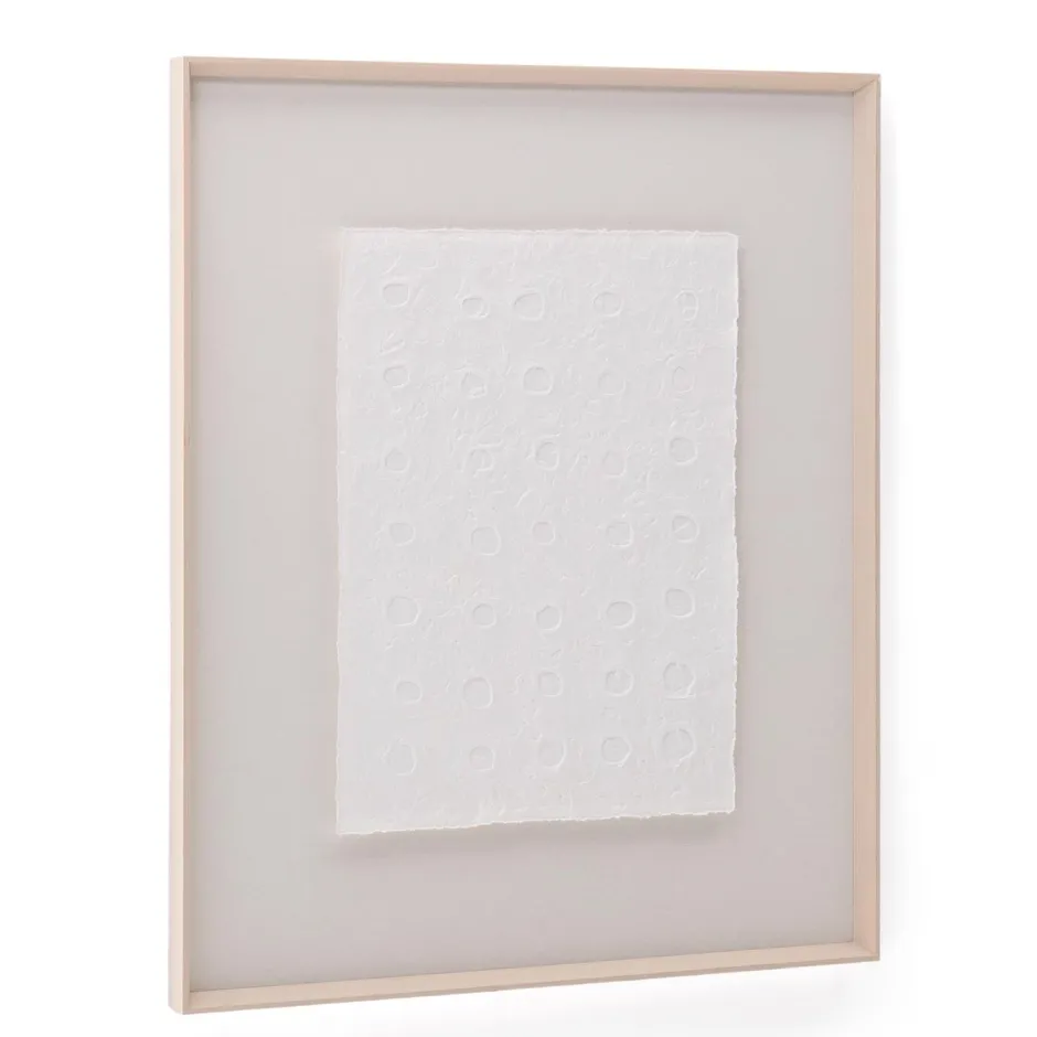 Het Olvin schilderij is gemaakt van wit gerecycled papier, met unieke handgemaakte reliëfs die opvallen door hun authentieke karakter. Elk exemplaar is het resultaat van een druktechniek die een gecentreerd patroon van stippen en cirkels creëert, wat textuur en dimensie geeft aan het ontwerp. De strakke afwerking maakt het een ideale keuze om een artistiek en origineel detail toe te voegen aan elke ruimte. Het is ook perfect te combineren met de andere schilderijen in de collectie, zodat u harmonieuze visuele composities vol karakter kunt creëren. Elk reliëf weerspiegelt de toewijding in de uitwerking ervan, waardoor dit werk een decoratieve aanvulling is die duurzaamheid en eigentijds design combineert.