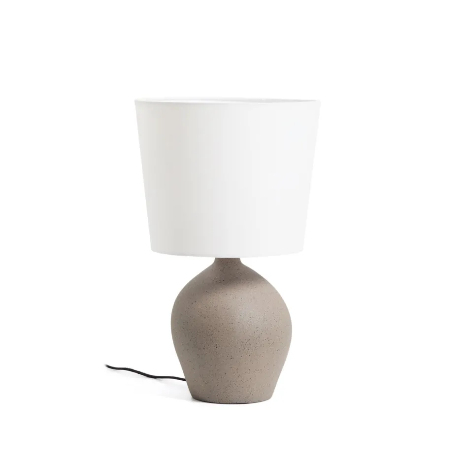 Deze tafellamp combineert een gestructureerde voet met steeneffect met een ivoorkleurige katoenen kap, waardoor een subtiel en elegant contrast ontstaat. De stevige, organisch gevormde basis voegt karakter en persoonlijkheid toe aan het geheel, terwijl de kegelvormige kap het licht verzacht en een warme, uitnodigende sfeer creëert in elke kamer. Dankzij het uitgebalanceerde ontwerp kan hij gemakkelijk worden geplaatst in slaapkamers, woonkamers of werkruimtes en voegt het een opvallende en tijdloos detail toe. De lamp is compatibel met E27-lampen tot 40W, apart verkrijgbaar. Een functioneel en decoratief product, ontworpen om de sfeer van je huis te transformeren met unieke details en zorgvuldig geselecteerde materialen.