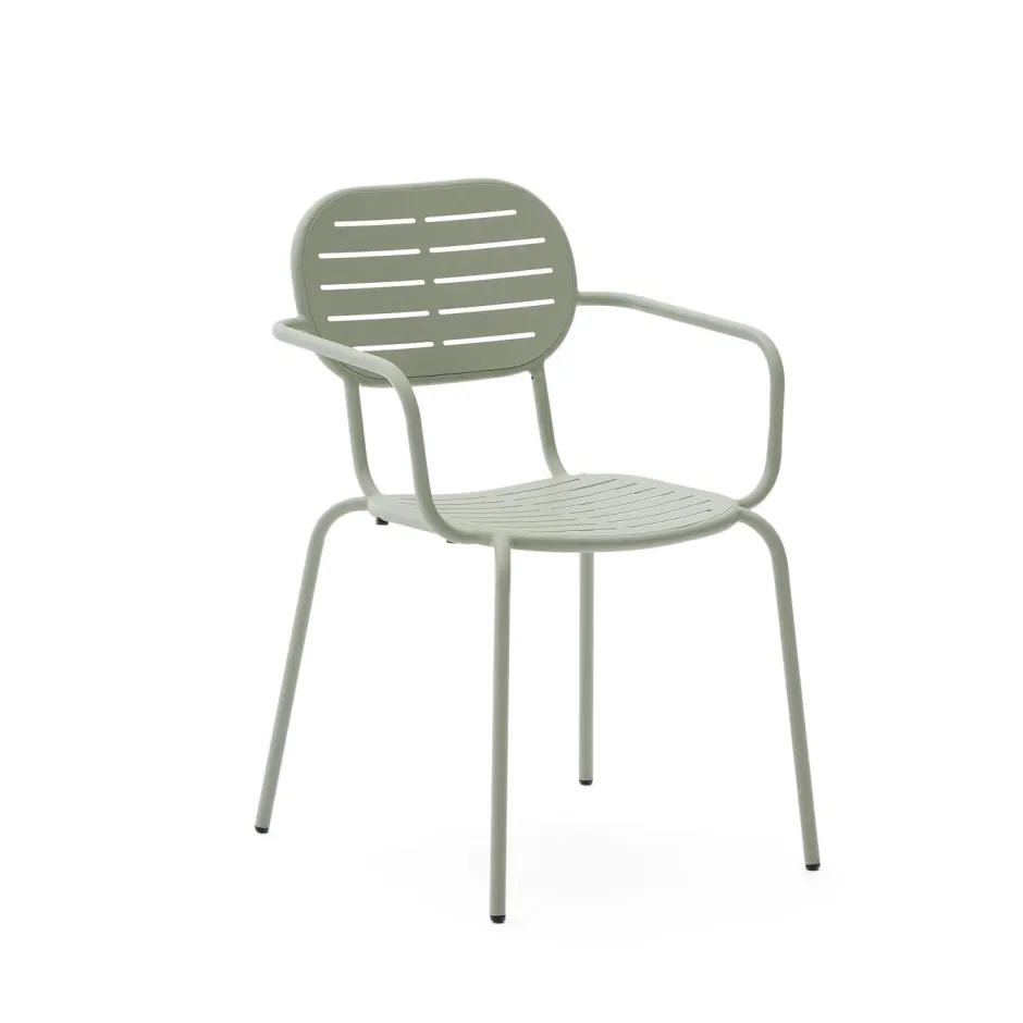 - Stoel met armleuningen van gegalvaniseerd staal met groene afwerking, slijtvast en corrosiebestendig en daarom duurzamer dan gewoon staal.