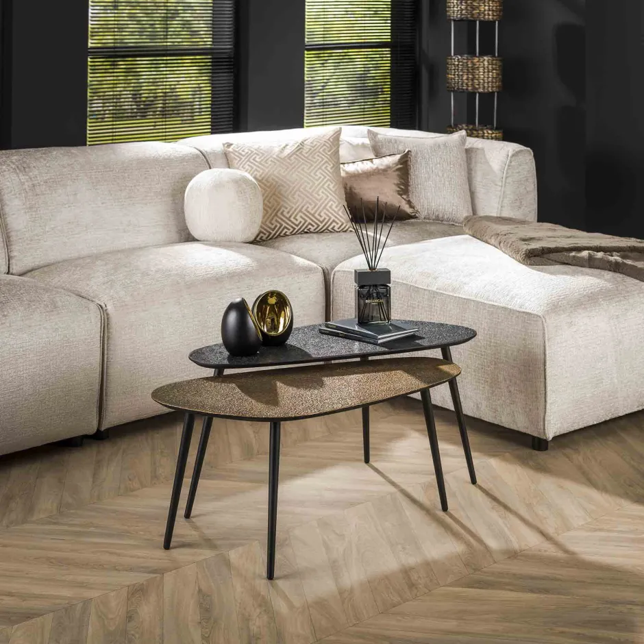 Deze trendy niervormige salontafel set van 2 is uitgevoerd in ‘metallic’ antiek brons/goud en zwart. Op het verjongde blad zit een hele mooie bewerking welke een unieke uitstraling geeft. De tafels kunnen naar eigen inzicht speels bij elkaar neergezet worden. Deze set is een echte eye-catcher en maakt deel uit van de ‘metallic’ serie.