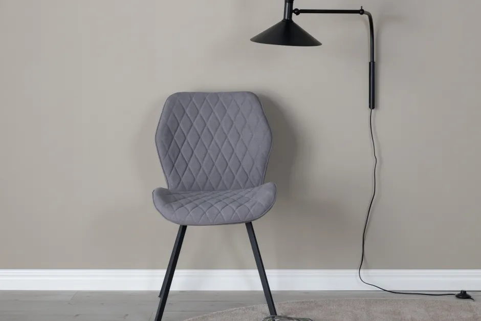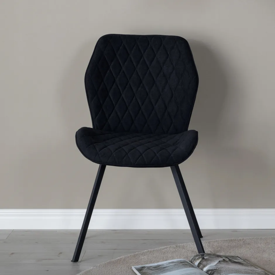 Jakara is een eetkamerstoel met alle juiste eigenschappen – praktisch, strak en tijdloos! In een volledig gestoffeerd exclusief ontwerp met poten van zwart gepoedercoat metaal en een gecapitonneerde rugleuning en zitting in een komvormig ontwerp van zwarte polyester stof, krijg je een stoel met een hoog comfort. Decoratieve naden aan de binnenkant van de rugleuning en zitting vormen een stijlvol ruitpatroon. Enige montage vereist.