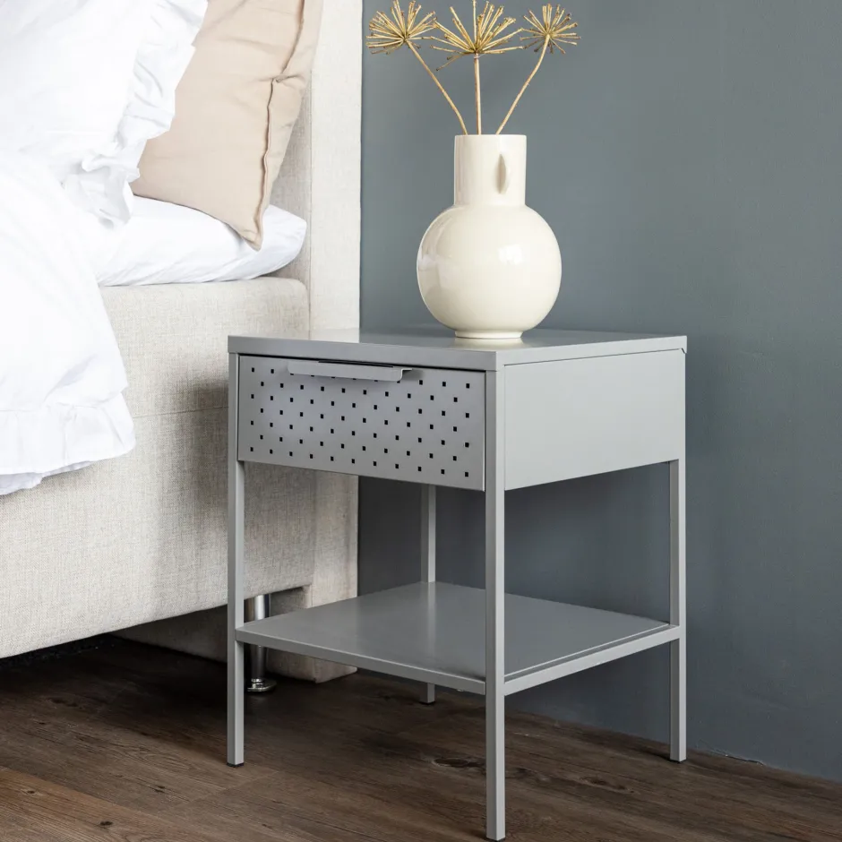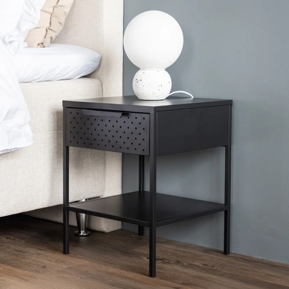 Het gepoedercoate zwarte staal voegt een vleugje elegantie toe aan het nachtkastje en maakt het gemakkelijk te combineren met je algemene inrichting. Elk detail is zorgvuldig ontworpen om een harmonieuze sfeer in je kamer te creëren.