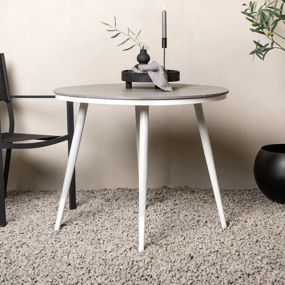 De eettafel Erikka is perfect voor wie een uitnodigend gevoel wil creëren op zijn terras. Het onderstel is van zwart gelakt aluminium met een schijf in Aintwood. Met zijn ronde ontwerp kunnen gesprekken en gelach vrij rond de tafel stromen. Maak je klaar voor alle zomeravonden buiten!