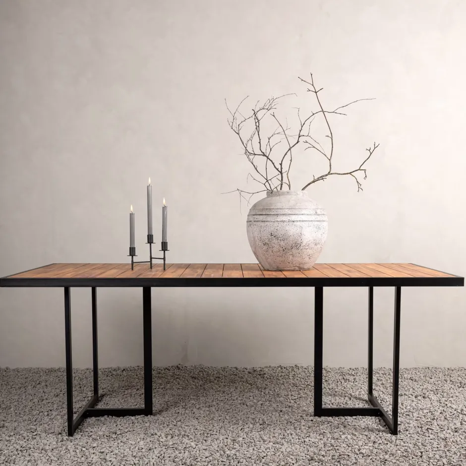 Eettafel Julieanne in bruin acacia met een decoratief frame en onderstel in zwart staal. Een eettafel die net zo goed in de tuin als op het terras past. Geniet samen van de heerlijke zomermomenten! Lees meer onder ons onderhoudsadvies over hoe je het beste voor je tafel kunt zorgen.