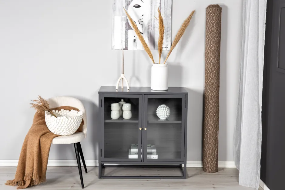 Baktal, in modern industrieel ontwerp gemaakt van gepoedercoat zwart staal met twee glazen deuren met een frame van gepoedercoat zwart staal en twee reliëfvlakken. De deuren hebben messingkleurige knoppen. De hele kast rust op een open frame van zwart gepoedercoat staal. Afmetingen: Lengte: 85 cm, breedte: 40 cm, hoogte: 85 cm. Lichtere montage vereist.