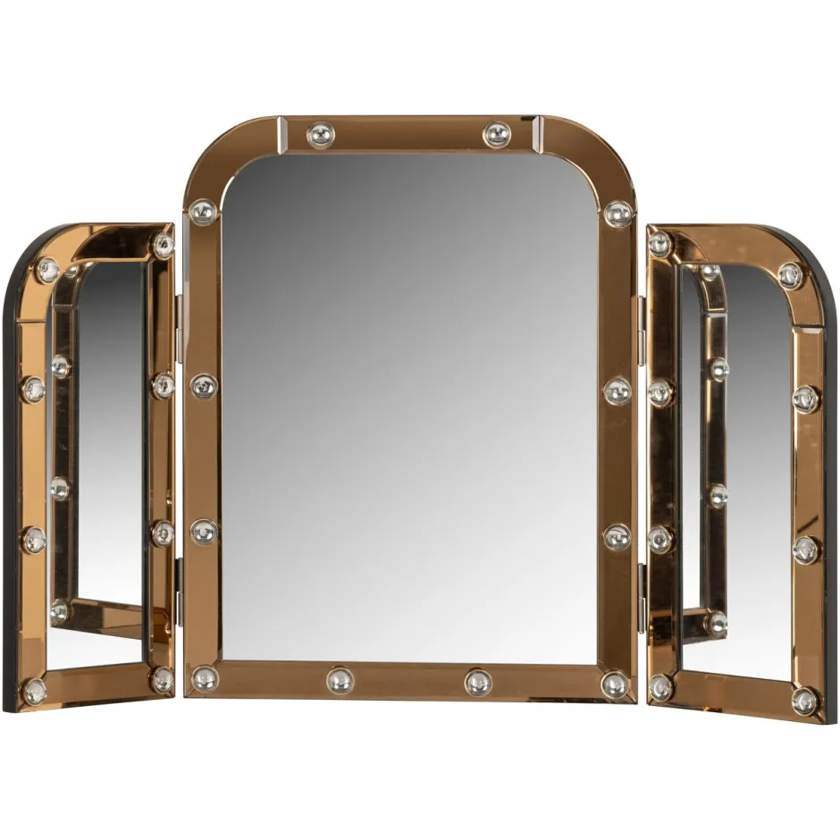 De tafelspiegel Jaira is een stijlvolle en functionele toevoeging aan je make-up of kaptafel. Met zijn elegante drieledige ontwerp en goudkleurige omlijsting biedt Jaira een klassieke uitstraling met een moderne twist. De spiegel is versierd met subtiele decoratieve elementen die de rand omlijsten, wat een vleugje luxe toevoegt aan het geheel. Dankzij het opvouwbare ontwerp kun je de zijpanelen eenvoudig aanpassen voor een optimale hoek, waardoor Jaira niet alleen mooi, maar ook praktisch is. Deze spiegel is perfect voor dagelijks gebruik en voegt een verfijnd accent toe aan je interieur.