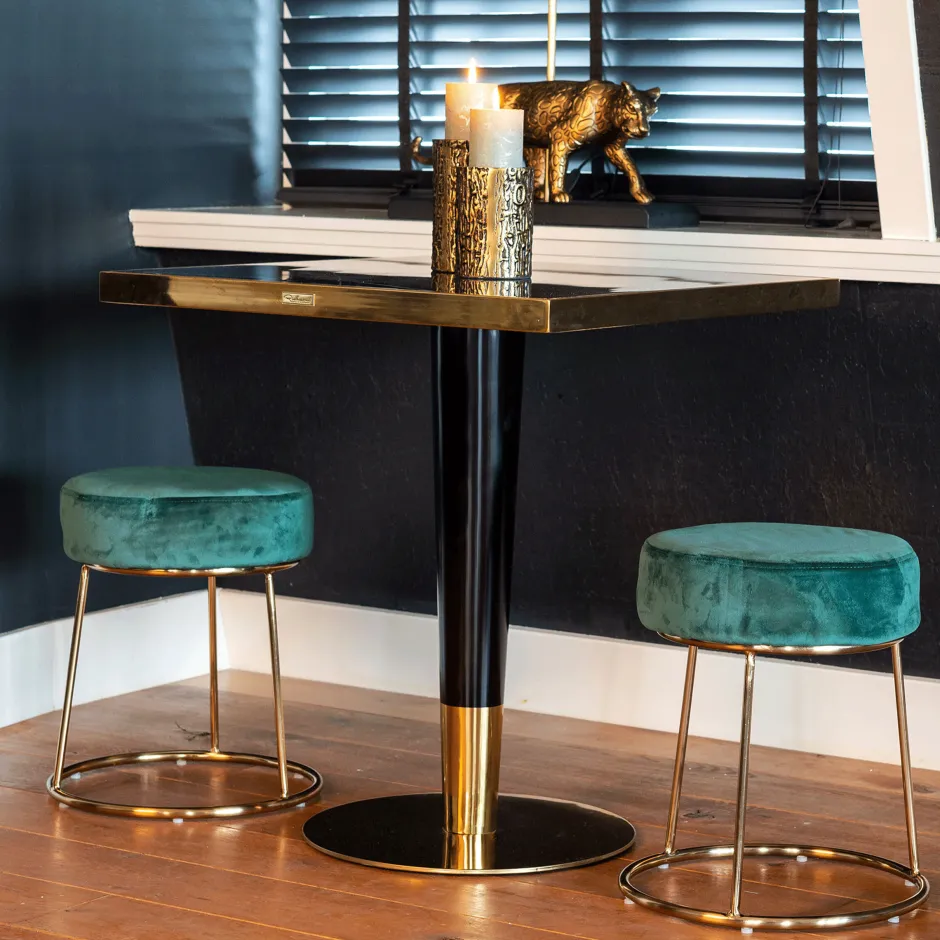 Eettafel Can Roca is een vierkante tafel met chique uitstraling. Een vierkant blad van zwart faux marmer met gouden deta…