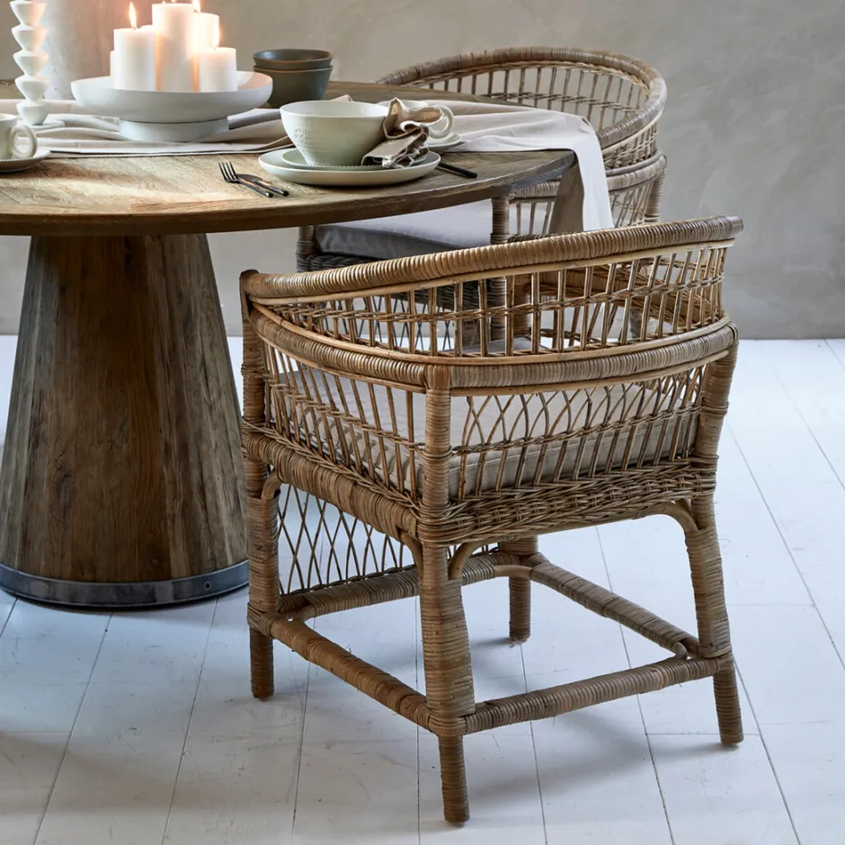 De Victoria Falls Dining Armchair is een luxe eetkamerstoel gemaakt van rattan. De rattan stoel wordt helemaal met de hand gemaakt en gevlochten in Indonesië. De stoel heeft armleuningen die doorlopen in de rugleuning. De comfortabele eetkamerstoel wordt geleverd met lichtgekleurd, katoenen kussen.