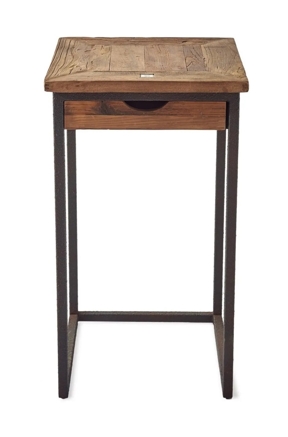 Nachtkastje van oud recycled hout en een ijzeren onderstel is voorzien van een stevige lade. De mix van oud hout en ijze…